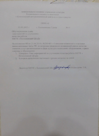 Приказ № 01 об утверждении плана мероприятий по улучшению качества работы МКУК "Коломинский ЦКиД" .