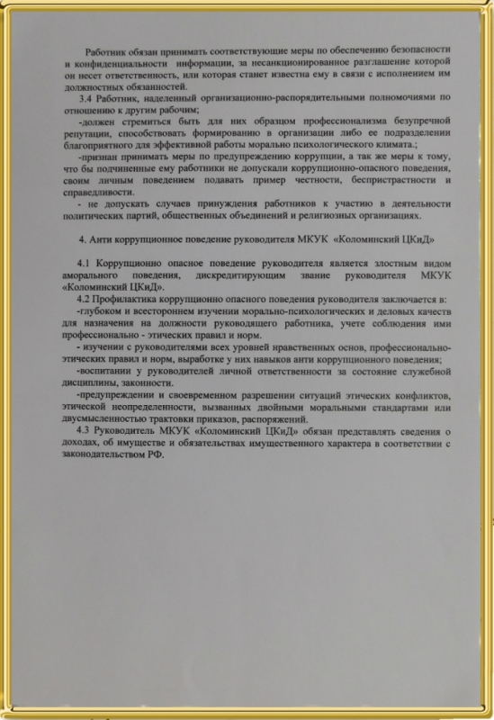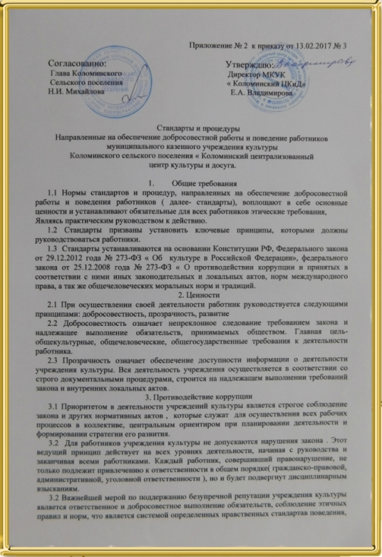 Стандарты и процедуры направленные на обеспечение добросовестной работы и поведение работников МКУК "Коломинский ЦКиД".