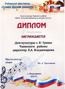 24.02.2019 года в с. Подгорное прошел районный конкурс "Слава Армии Родной". Коломинский ЦКиД был награжден дипломом первой степени.